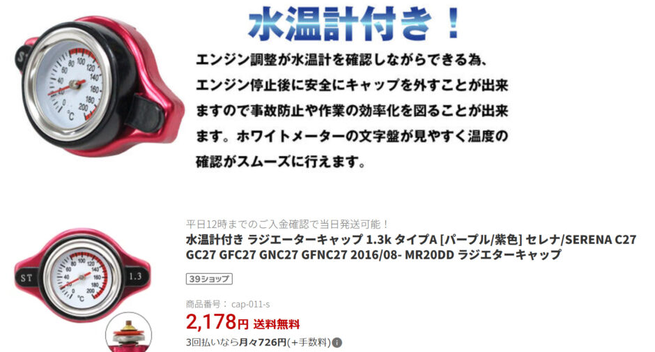 いわゆるラジエターキャップです。温度系付きの物があるのを知っていたので、今回はこれにしようとオーダーした訳です。
