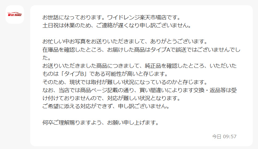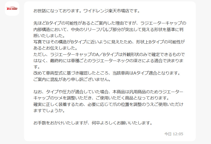 最初は写真を根拠に「Bタイプの可能性がある」と説明されたが、その後「車両型式ではAタイプ適合」と回答が変更されており、説明が一貫していない。