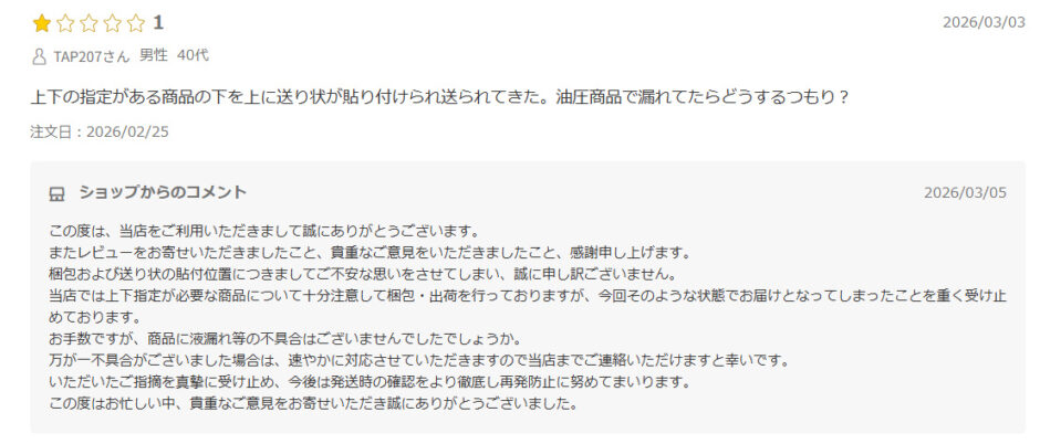 以上の点から判断すると、このショップでの購入は、今回購入した物は安い物ですが、そういう問題ではなくよほどの理由がない限り事故やトラブルの原因になりかねません。そのため、基本的には購入を控えた方がよいと思います。